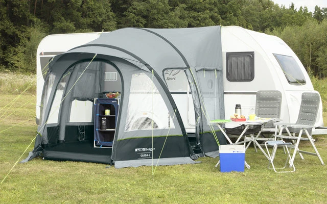 Das Wohnwagen-Teilvorzelt Garda Air sorgt für schnelle Entspannung und maximale Flexibilität am Urlaubsort! Dank aufblasbarem Gestänge und Einzug in die Kederschiene lässt es sich unkompliziert und schnell aufbauen. Das Garda Air bietet einen lichtdurchfluteten und gemütlichen Wohnraum, in welchem es sich auch bei schlechtem Wetter gut verweilen lässt. Durch die großen Panoramafenster, welche auch von innen blickdicht verschlossen werden können, haben Sie die Umgebung bestens im Blick. Das Vordach im Haupteingang bietet Ihnen zusätzlichen Schutz vor Regen. Für eine gute Belüftung finden Sie Dauerbelüftungen an der Vorderwand, sowie Moskitogaze an der Vordertür und an den seitlichen Fenstern. Das Teilvorzelt verfügt des Weiteren über einen zusätzlichen Seiteneingang auf der rechten Seite. Die Höhe im Zelt beträgt 243 cm.